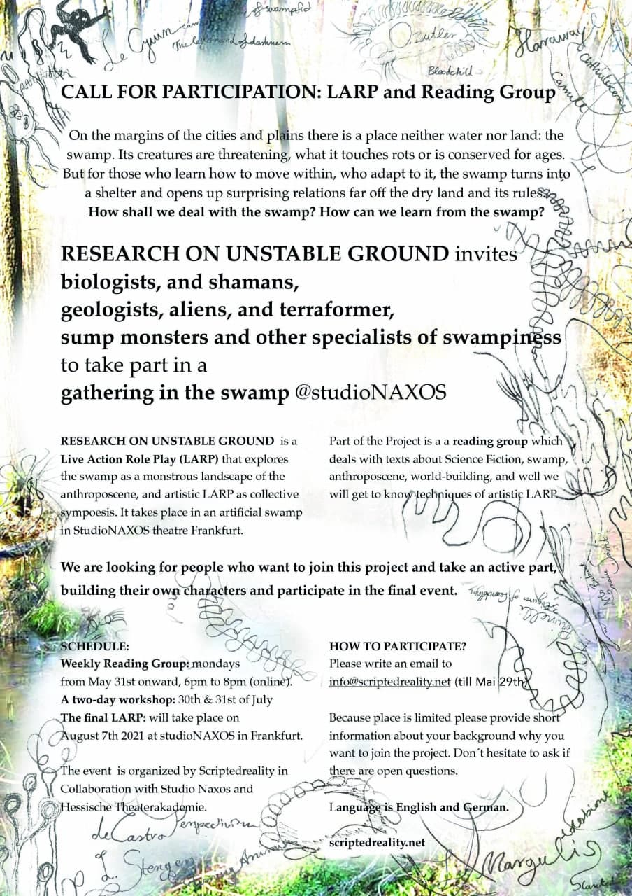 RESEARCH ON UNSTABLE GROUND versammelt Parabiologinnen, Schamaninnen und Geologen, Aliens, Künstlerinnen und Terraformer, Sumpfmonster und andere Spezialistinnen der Swampiness für ein gemeinsames Zusammentreffen im Sumpf und erforscht den Sumpf als monströse Landschaft des Anthropozäns sowie das LARP als kollektive Sympoiesis.
