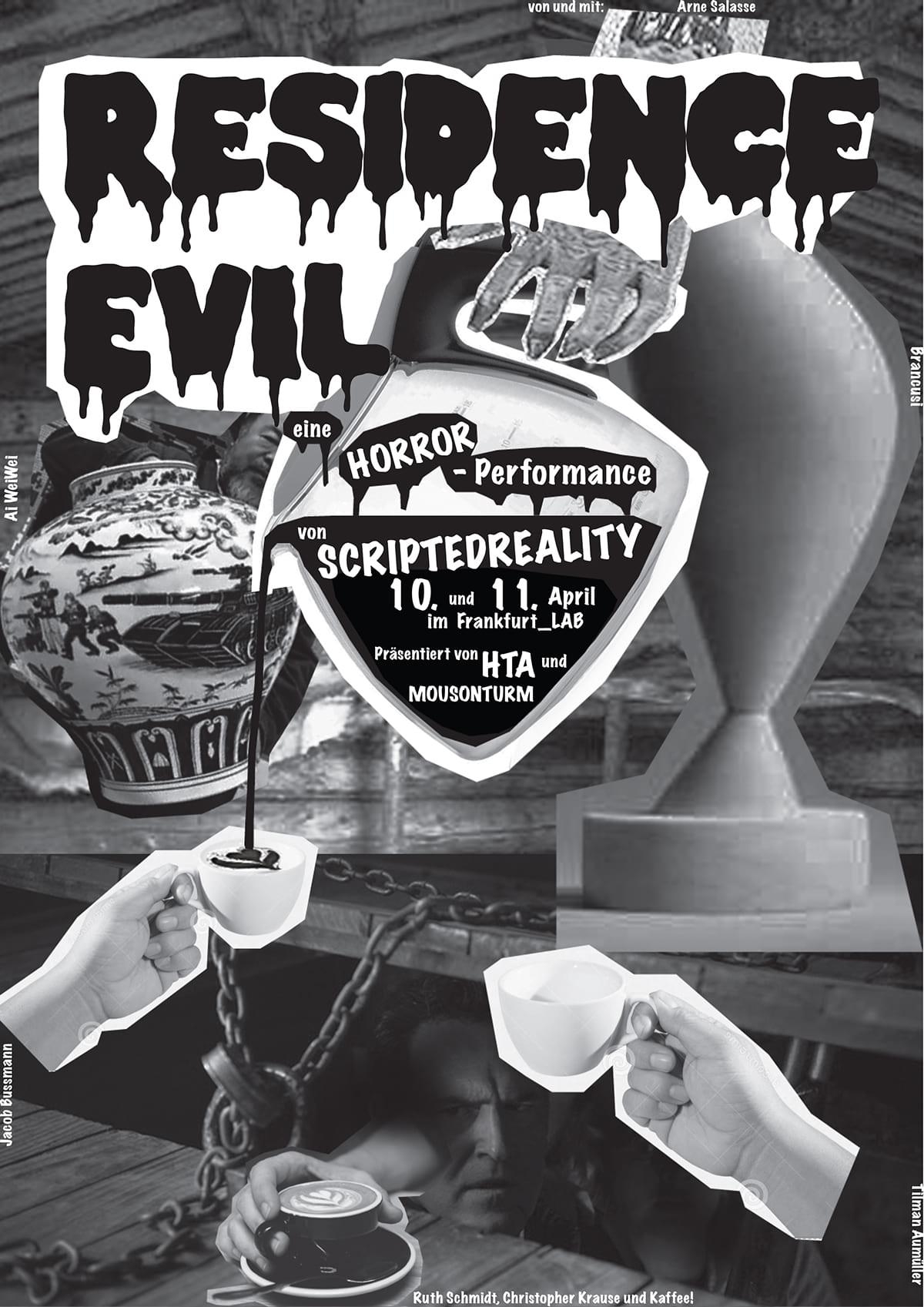 Residence Evil ist eine Meditation über Arbeit, Arbeitsverweigerung, Panik angesichts der Perfomanceszene und über die Rolle, die Fake und Theater in der Konstruktion unserer Wirklichkeit spielen.