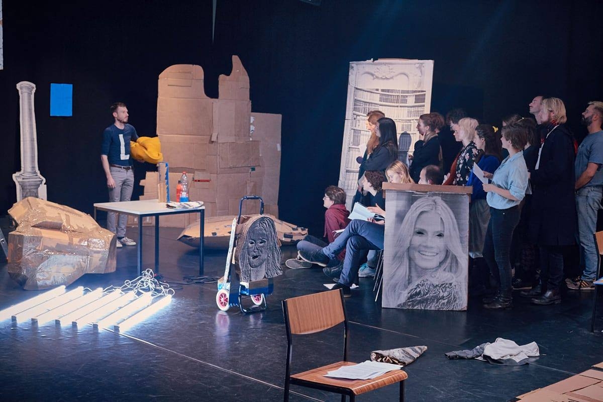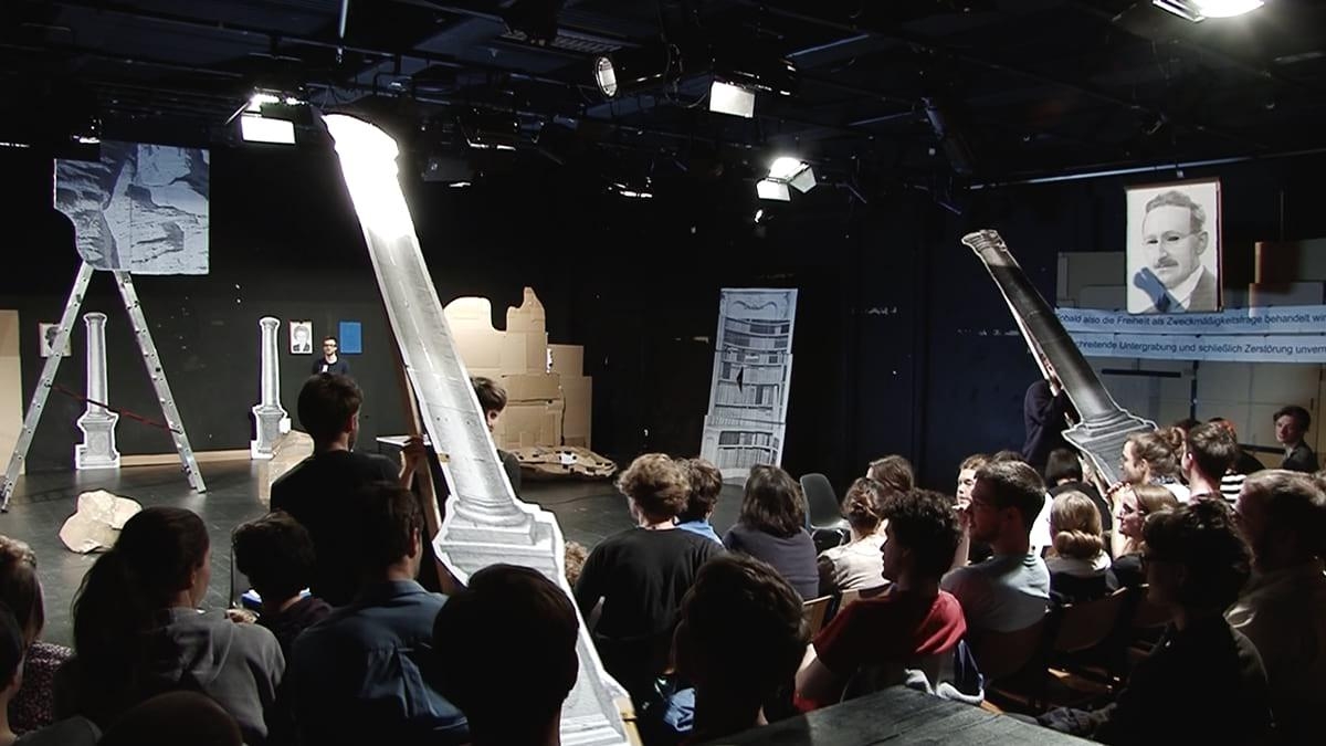 The Piece Concerning the Question of Purposefulness was developed in the context of the debt and financial crisis of the last years and is an attempt at politcial theatre on stage. The Piece Concerning the Question of Purposefulness is therefore a lot of things at once: It tries to invent narrations and contra narratives so as to understand the present and its trends beyond the daily news - succeeding the baroque theatre and its allegorical strategies in order to bring scattered matters together.