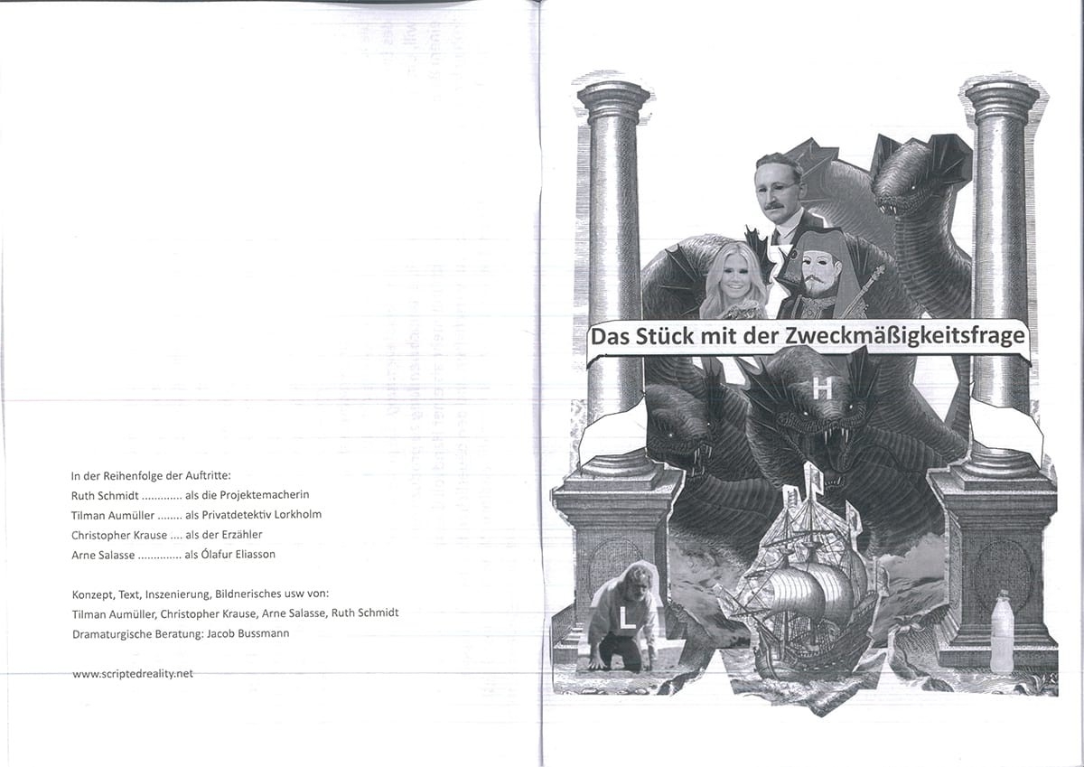 After this long prologue a narration takes place that has Benjamin ́s thought in mind that a worker is just able to understand his own position by transforming it into a story. The projectmakers don ́t want to do a new project as Defoe advised, but want to tell „a miraculous story“, one that is not committed to realization but is free-floating in the space of imagination. They start to investigate the failure of their own project. How did it occur? And why is there all of a sudden a corpse on stage? With the story now beginning, the stage is divided into two spheres: the front is the shared space of the narrators and the audience, where the story is told. The back belongs to the realm of the fantastic, where Lorkholm, private detective and avatar of the narrators, traces a much larger project, one that seems responsible for the failure of Hayek ́s banishment and that is always one step ahead. With their avatar Lorkholm the narrators land in the heart of the „H-Complex“, that is a lot of things at once: A stage, an art space in which everything is artificial and not for use. An island, that Lorkholm is stranding on like Robinson Crusoe. And a room that can be read like a „Parabel of the austerity politics“ with no way out, because every realistic story maintains a closed and unbroken fiction without exits. This H-Complex is populated by characters like Olafur Eliasson, who is miraculously the only one able to live in there, except oysters (that turn out to be austerized/oysterized projectmakers...).